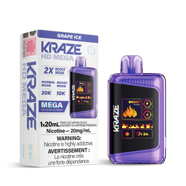 The Kraze HD Mega offers an unparalleled vaping experience with enhanced dual-coil technology, a massive 20mL e-liquid capacity, and up to 20,000 puffs. Customize your vape with Boost (24W) and Normal (12W) modes, plus adjustable airflow control. Its user-friendly design features a Mega HD OLED screen, light and dark mode toggles, and battery and e-liquid indicators. Enjoy sweet flavors and convenient Type-C recharging on the go.